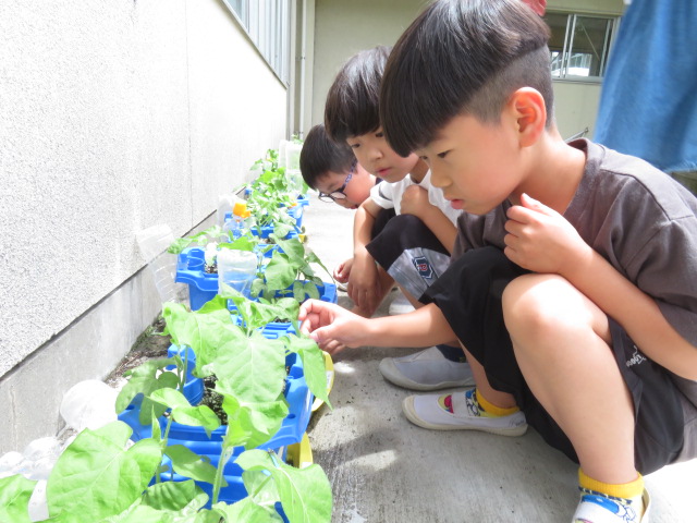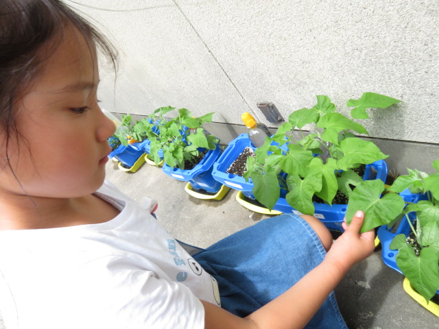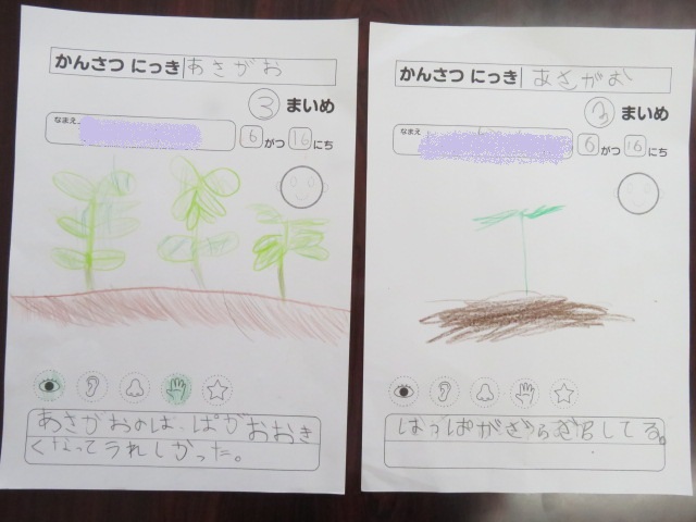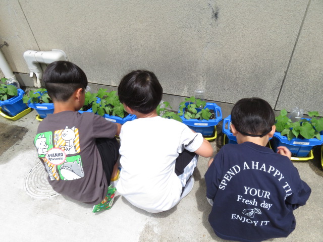 自分で種をまいて育てているアサガオに、愛着がたっぷりその変化や成長の様子に気づき、生き物を大切にしようとする気持ちが育っています