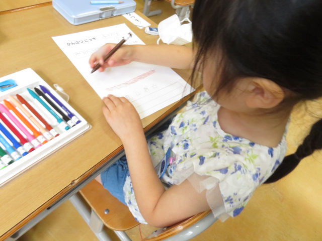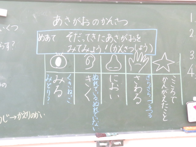 1年生が、育てているアサガオの観察をしています。「土曜日と日曜日、わたしたちがお休みしている間にぐんぐん大きくなってた」と目を真ん丸にして話してくれました。