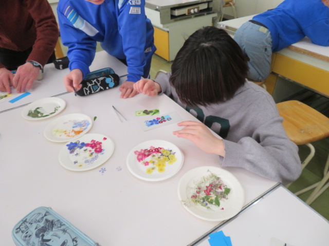 講師の先生が準備してくださった、たくさんの種類の押し花に目を輝かせながら