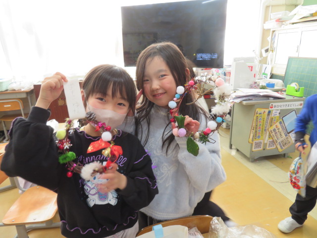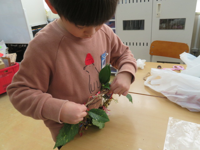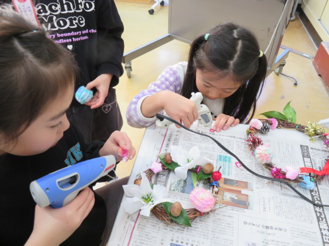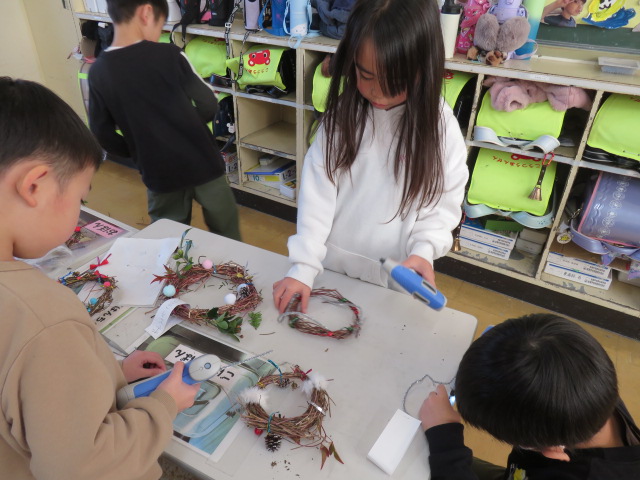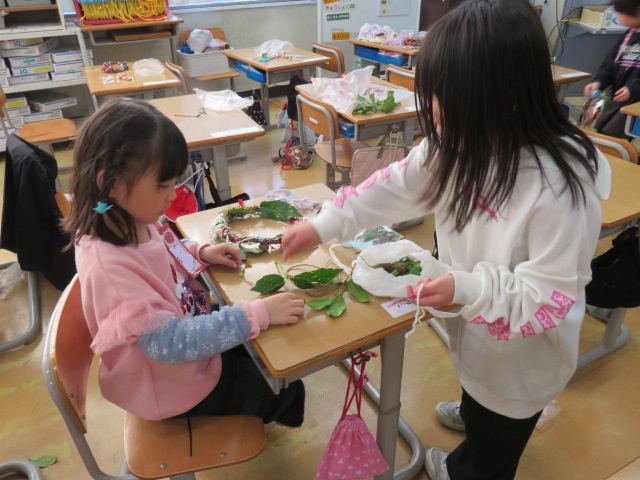 1年生が、春から大事に育てたアサガオのツルを使って、リース作りを楽しみました。