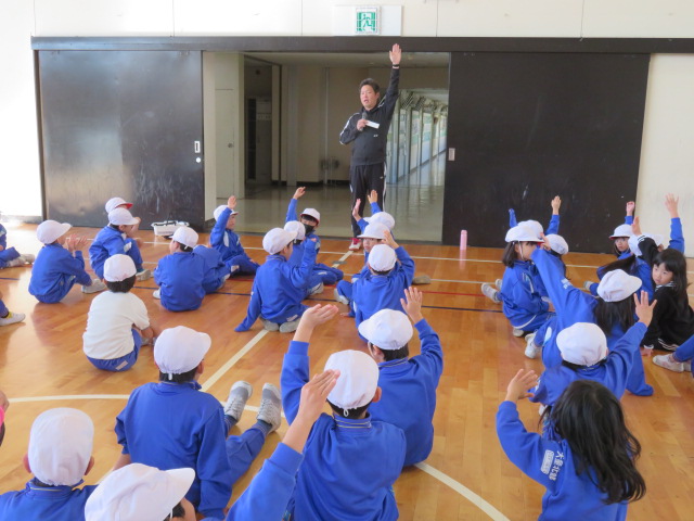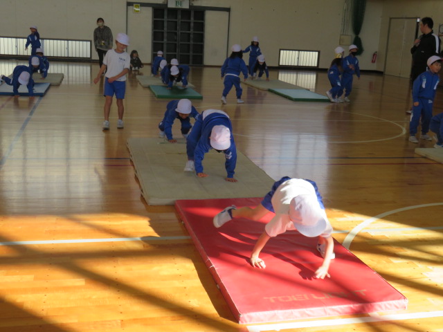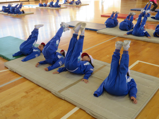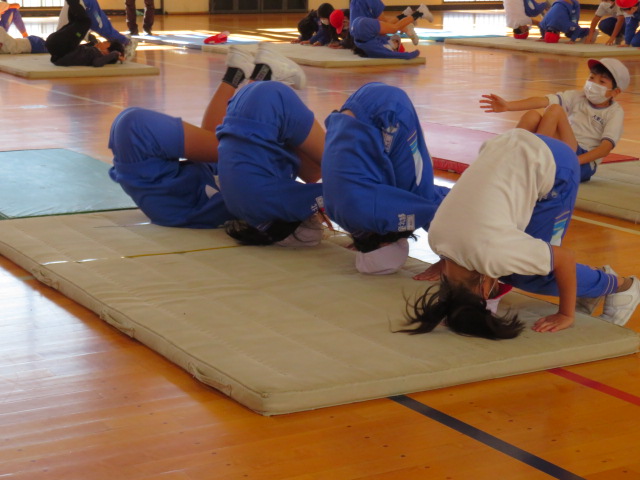 今日は、体操の先生を講師にお迎えし1~4年生のマット運動教室がありました。