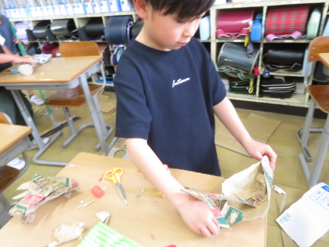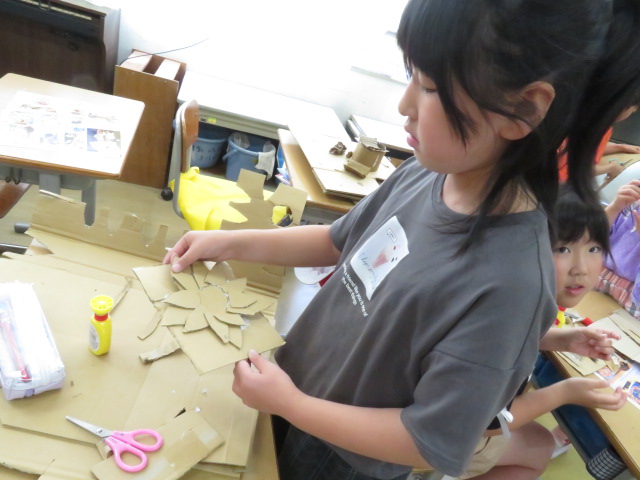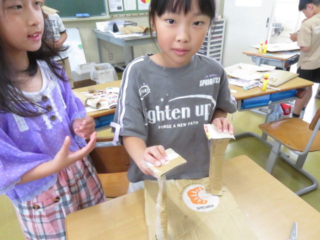 3年生の図工で、段ボールを使った工作をしています。