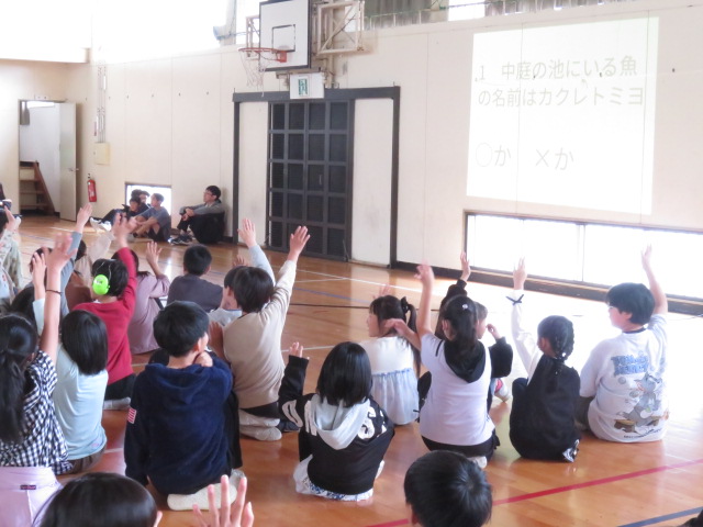 中庭にいるカクレトミヨや学校の歴史についての問題