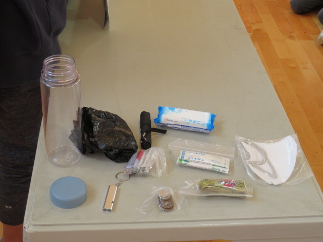 持ち歩ける防災グッズの例を実際に見せたり