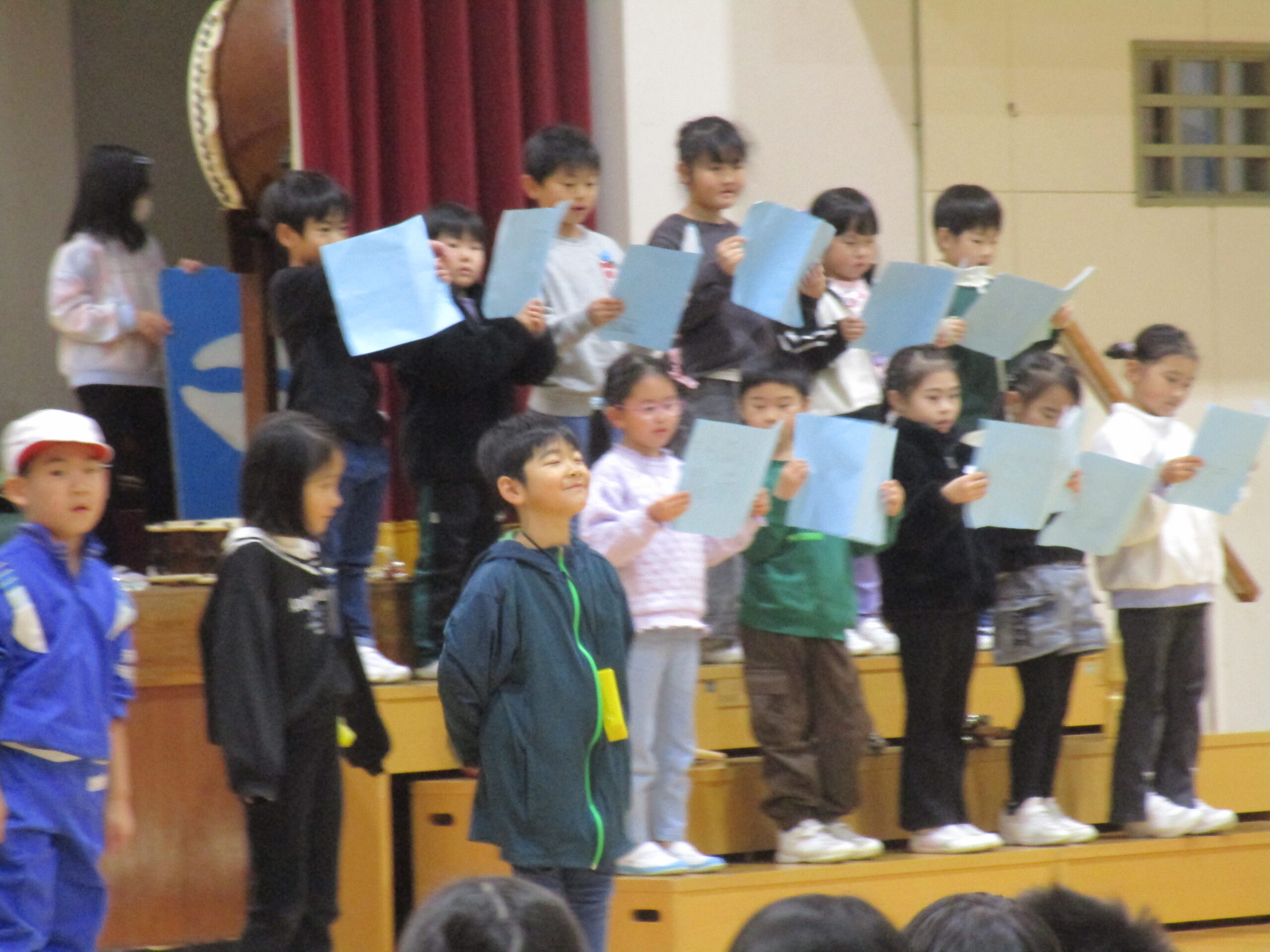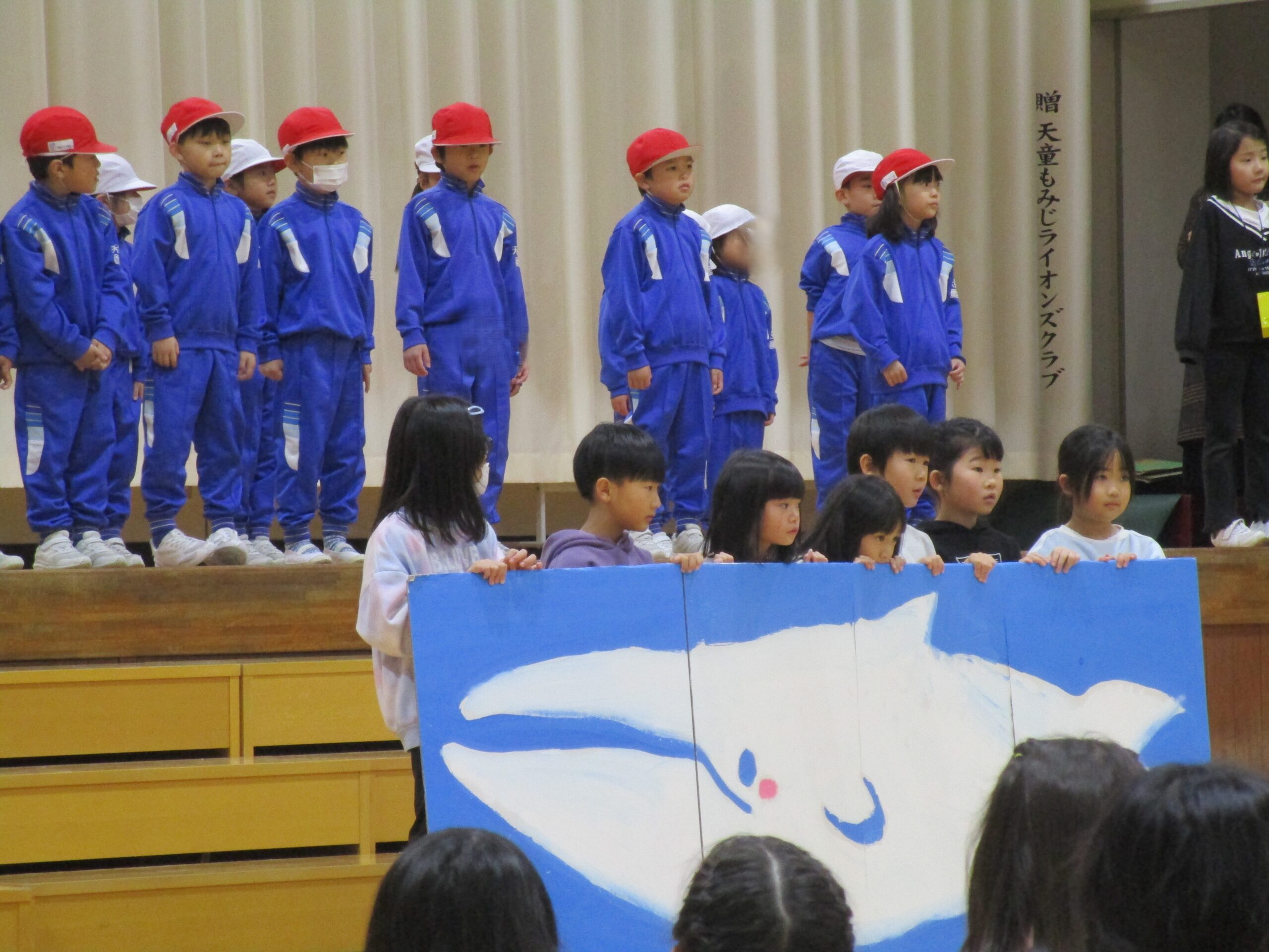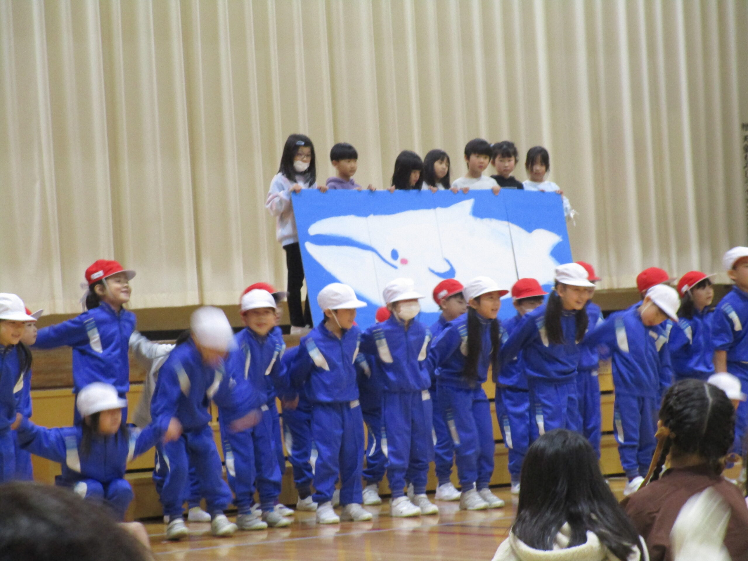 1年生は、国語で学習した「くじらぐも」を、自分達で考えたセリフを入れ、歌とおどりをまじえた発表でした。