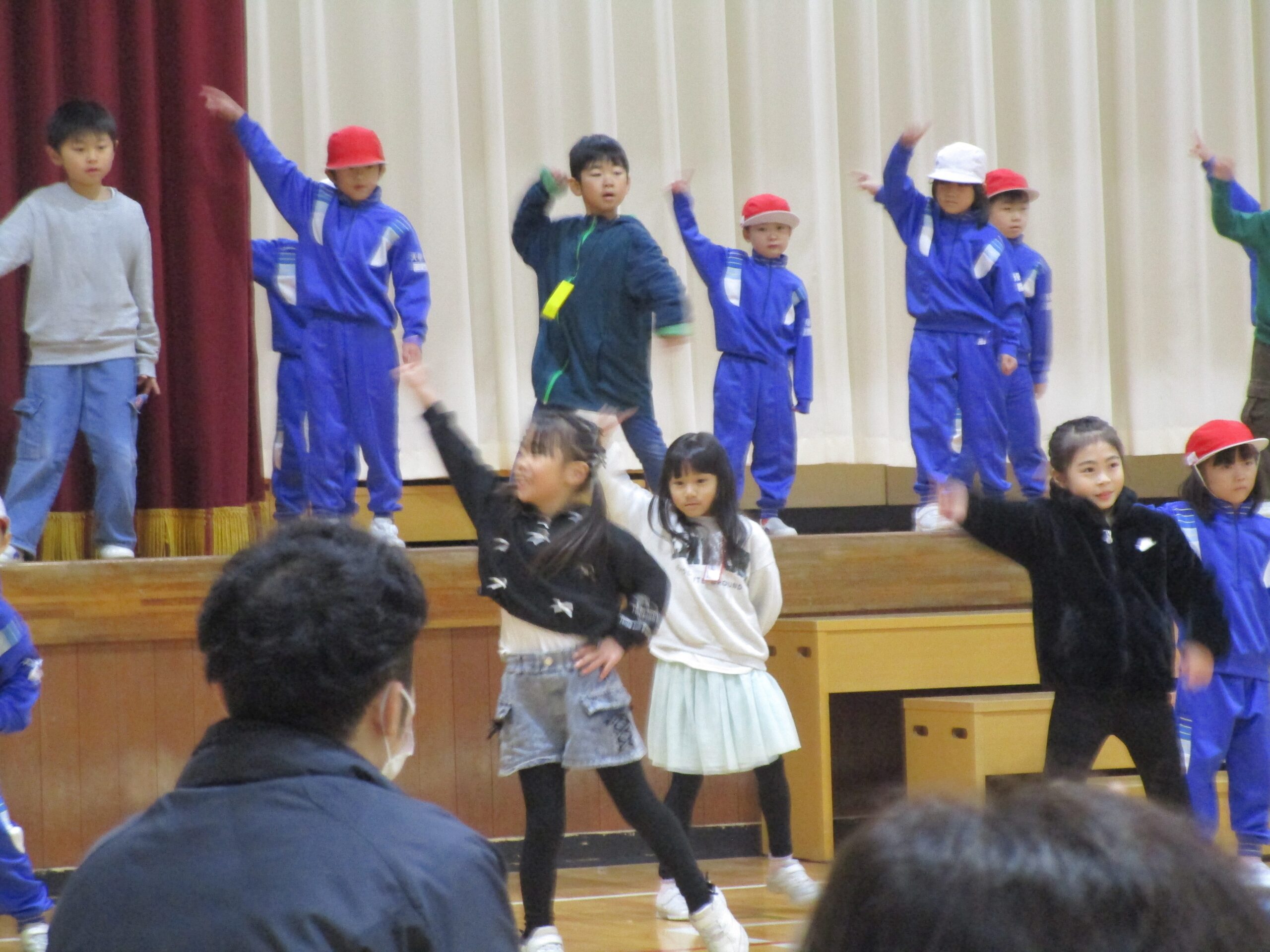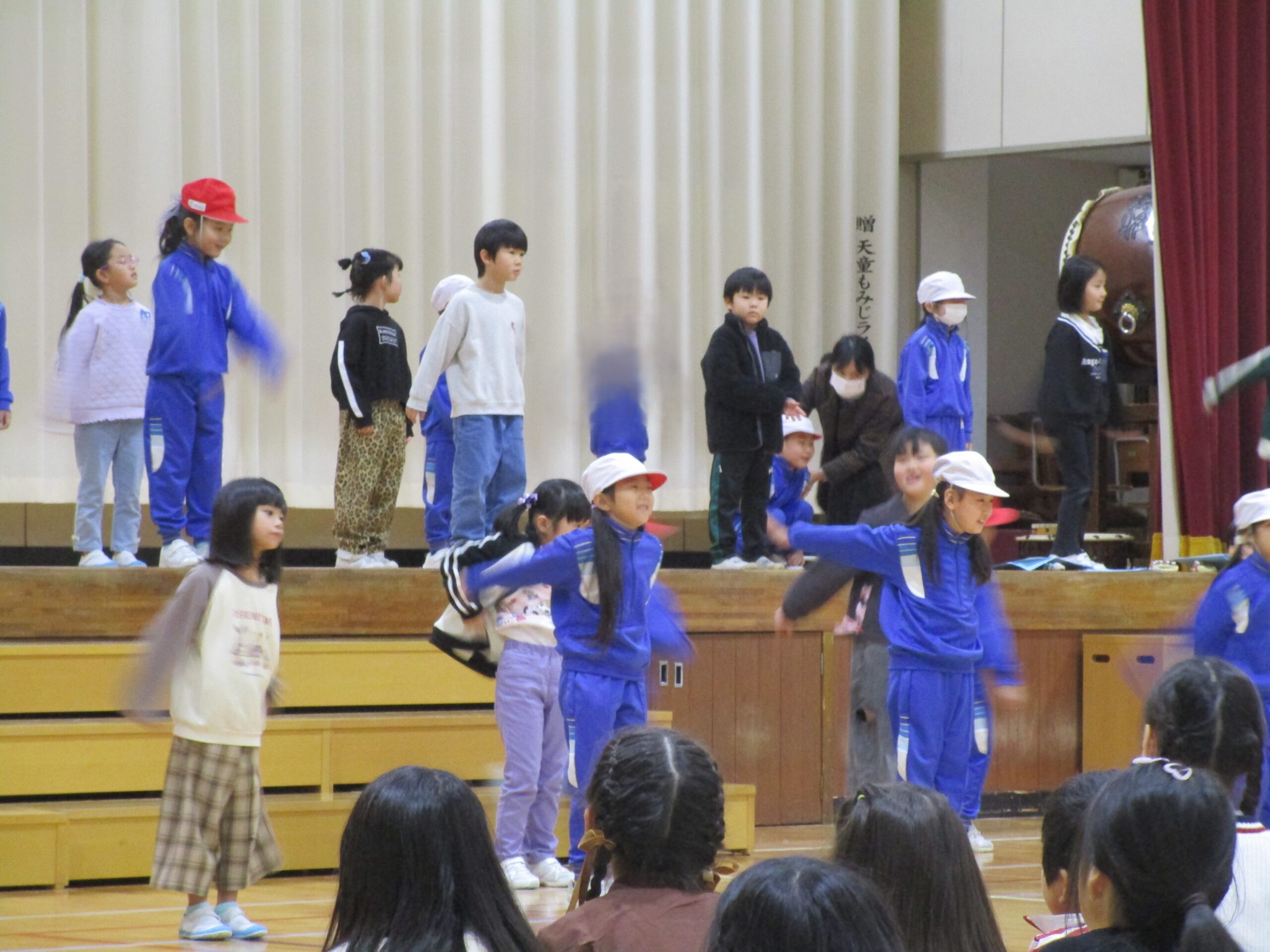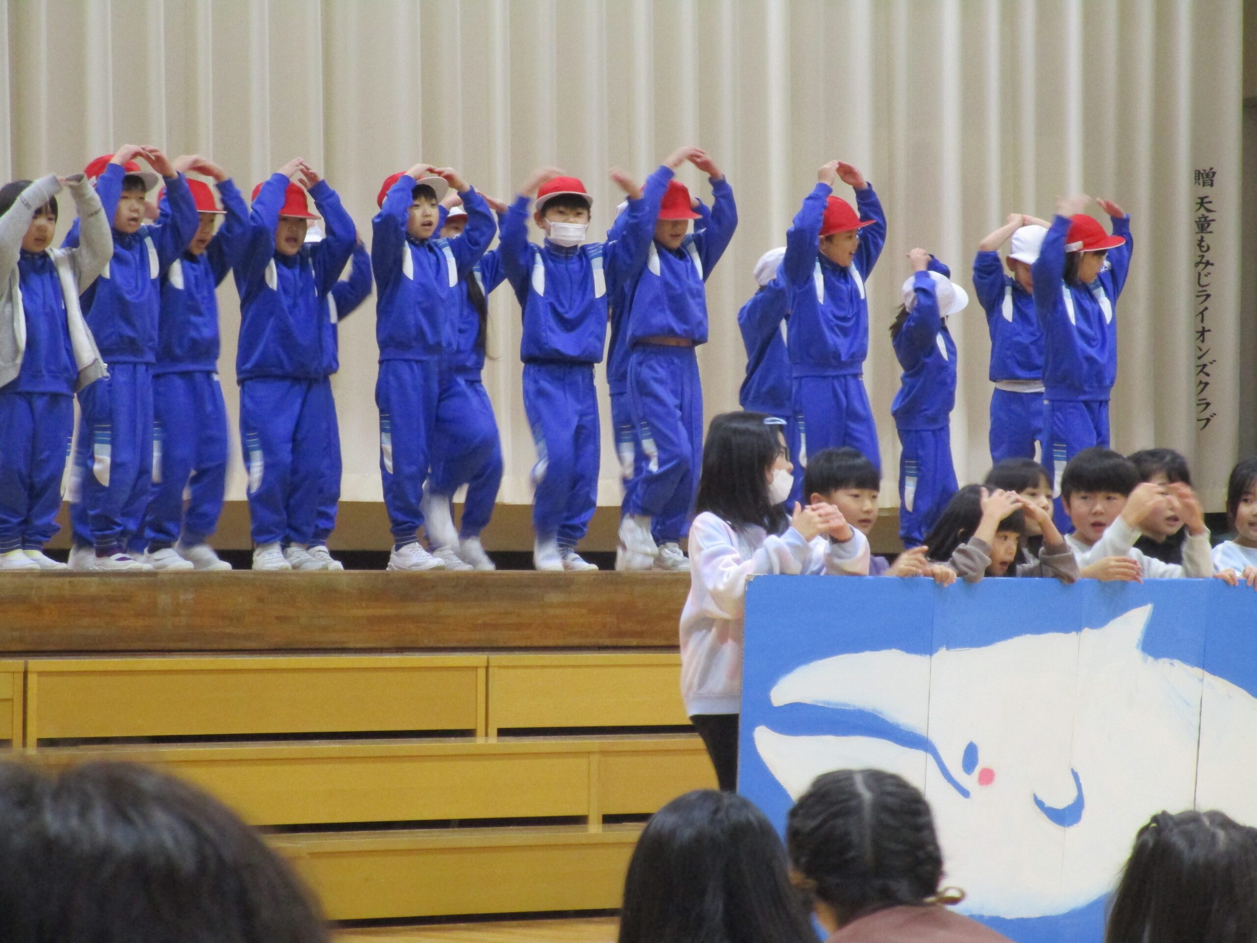 1年生は、国語で学習した「くじらぐも」を、自分達で考えたセリフを入れ、歌とおどりをまじえた発表でした。
