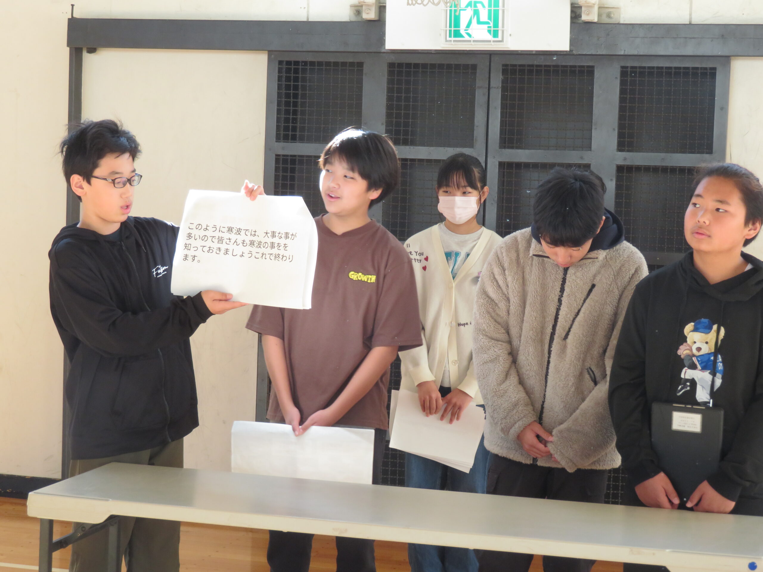 2組は「命を守ろう防災教室」のテーマももと、身の回りで起こりそうな災害を予想し、日ごろの備えをしようという内容でした。