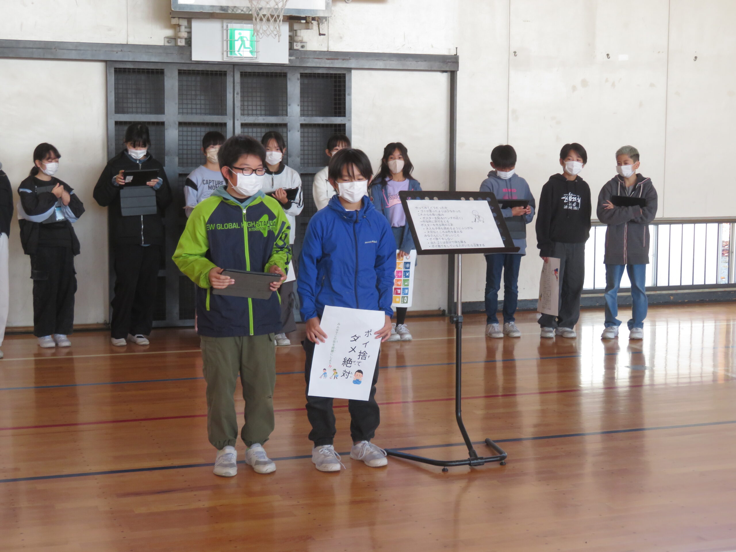 1組は「町をきれいにする」がテーマで 地域のゴミ拾いからわかったこと、考えたことを発表してくれました。